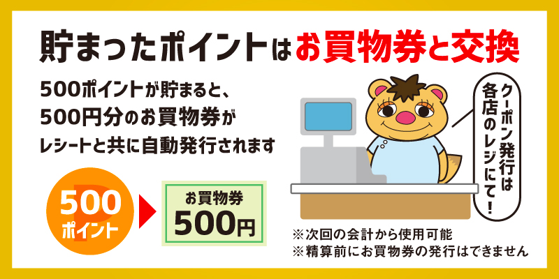 貯まったポイントはレジにて500ポイント毎に500円のお買物券がレシートと共に自動発行されます。